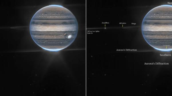 Las auroras sobre los polos norte y sur de Júpiter aparecen en colores más rojos, mientras que la Gran Mancha Roja, una tormenta más grande que la Tierra, se ve blanca. Una imagen muestra los tenues anillos de Júpiter y sus lunas Amaltea y Adrastea.