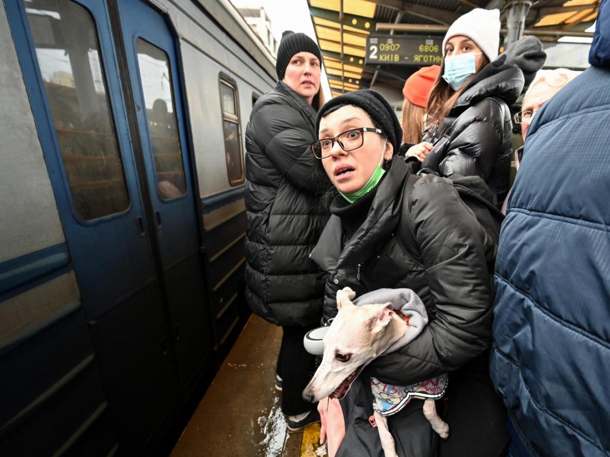 Una mujer lleva a su gato mientras camina cerca de la estación de tren Kyiv-Pasazhyrskyi en Kiev. El presidente ruso anunció una operación militar en Ucrania el 24 de febrero de 2022, poco después se escucharon explosiones en todo el país y su ministro de Relaciones Exteriores advirtió que se estaba produciendo una "invasión a gran escala".