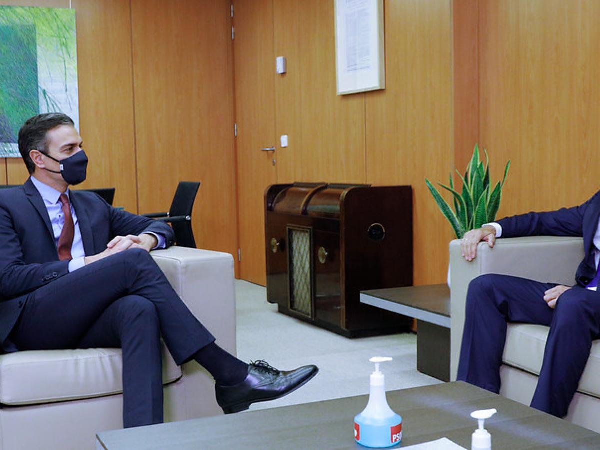 "Apostamos por una solución política", afirman en su mensaje, recogido por Europa Press, que acompañan de unas imágenes en las que se ve a Sánchez y López conversando, primero de pie, y después sentados en sendos sillones, y con la mascarilla puesta.