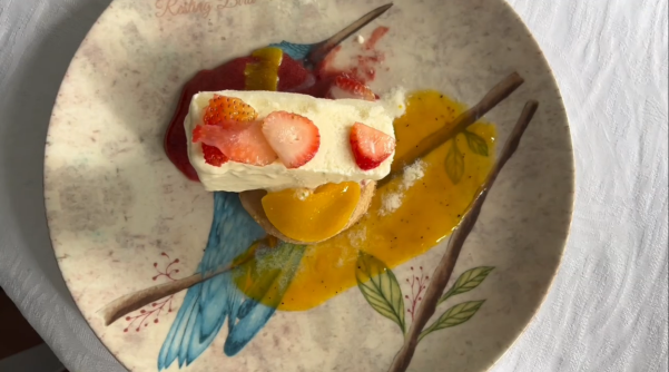 El cierre no puede ser menor a la alegría que han traído los dos primeros platos a los invitados. Entonces llega el último. Es una galleta de tartaleta rellena de crema pastelera de fécula de maíz, frutos silvestres (fresas, kiwi, chulupa, mora, remolacha y durazno) con salsa de maracuyá, y helado de sábila.