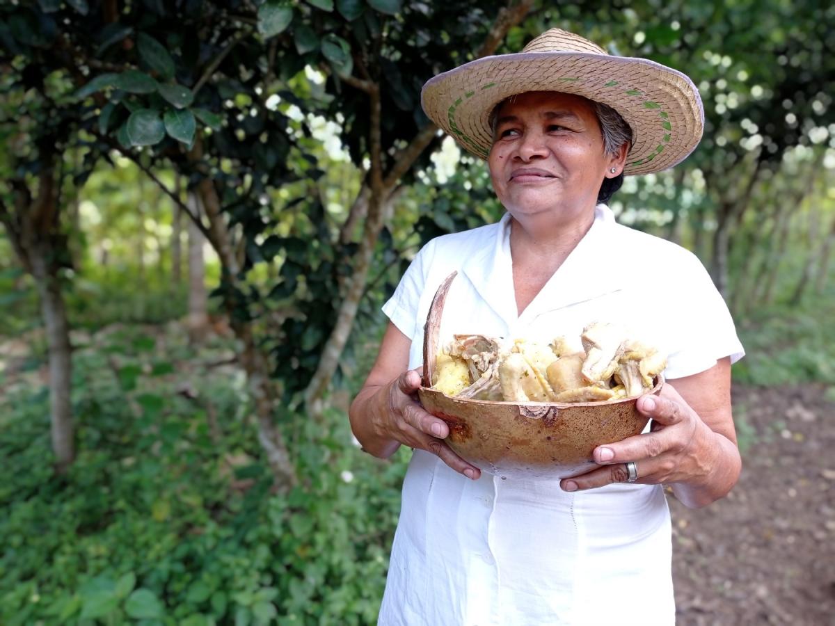 Además de maíz, al sancocho también se le añade yuca, un alimento que se cultiva en el bosque seco tropical y que además es rico en almidón, baja en proteínas y grasa, aporta vitaminas, minerales, complejo B y potasio y por lo general nunca ha faltado dentro de la alimentación de las familias de la región. A este tubérculo se le puede acompañar con carne de res y hasta suero hecho con las manos y el sabor que tiene Cecilia.