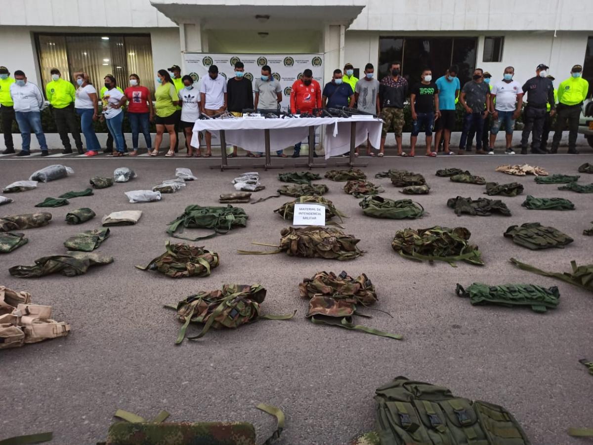 A los capturados también les fue decomisado armamento de diferentes tipos con proveedores y cartuchos para las mismas, varios gramos de droga sintética, cocaína, celulares de diferentes marcas, 32 chalecos arnés, 18 morrales, 16 uniformes pixelados, 61 gorras pixeladas, 10 ponchos pixelados, cintelas pixeladas y pañoletas, avaluados en más de 70 millones de pesos.